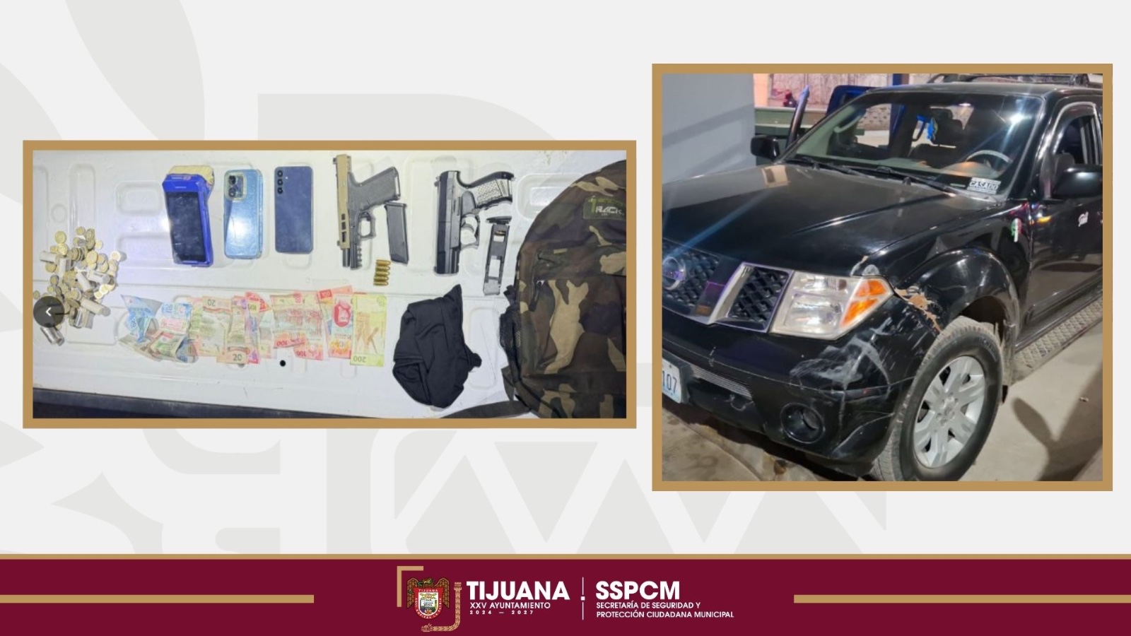 Durante la intervención se les aseguró un arma tipo pistola calibre 9 milímetros, abastecida con cinco cartuchos útiles, así como un artefacto bélico de utilería. Asimismo, se localizó una mochila de tela color negro con camuflaje, en cuyo interior se encontraban diversos artículos presuntamente relacionados con el robo.