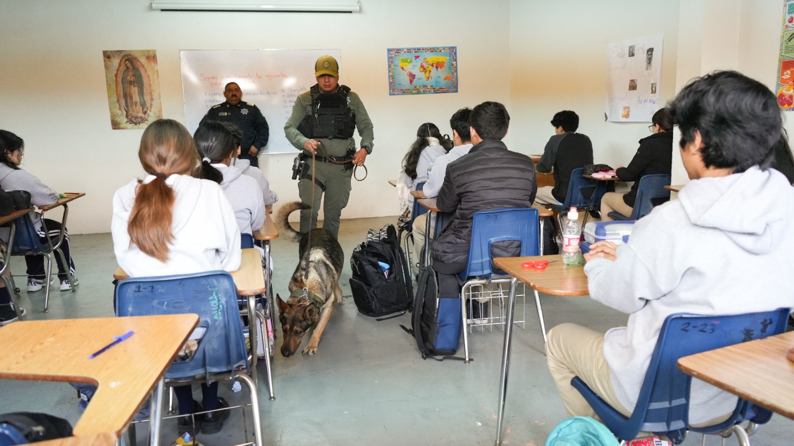 Durante esta jornada preventiva, agentes de Prevención del Delito, en coordinación con la Unidad de Operaciones Caninas K9, realizaron recorridos en distintos salones del plantel para llevar a cabo revisiones preventivas de mochilas y pertenencias, siempre bajo un enfoque respetuoso, transparente y en coordinación con las autoridades escolares, con la finalidad de detectar y retirar objetos que no correspondan al entorno educativo.